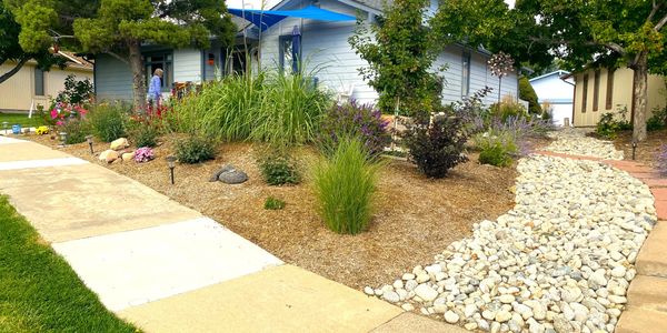 We removed the lawn, converted their sprinklers to drip irrigation, and installed a beautiful xeriscape that completely transformed the front yard